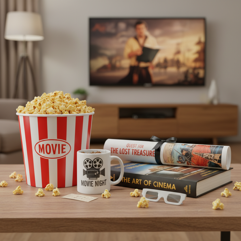 - Zestaw “Wieczór filmowy” – film, popcorn, koc, gadżet tematyczny.